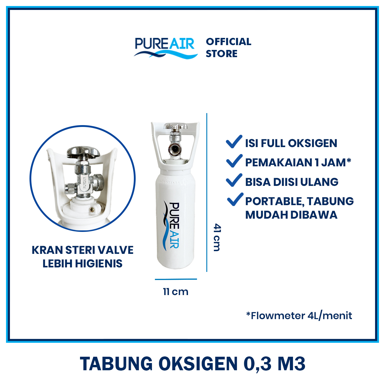 Tabung 0,3 M3 sudah berisi oksigen, disertai tutup tabung tulip plastik dan kran/Steri Valve QF-2G1. Durasi penggunaan tabung oksigen sekitar 1 jam (dengan flow meter 4L/menit).